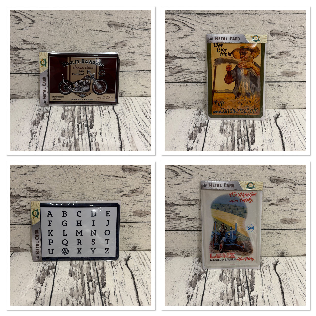 Blechpostkarten · Rückseite beschreibbar (papierbeschichtet) · Mit Umschlag zum Versenden · Einzeln in Folienbeutel verpackt · Format 10x14 cm.