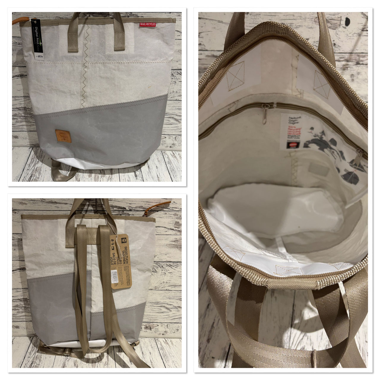 Aus recycling Segeln gefertigter Rucksack, zwei Außentaschen plus Laptopfach - aufgenähte Zahlen. Besonders geeignet als Strandtasche, Einkaufstasche und Rucksack